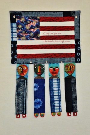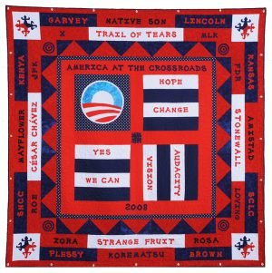“America at the Crossroads” 2008 DESCRIPTION I was inspired to create this quilt, America at the Crossroads, during the course of the 2008 presidential campaign.  The purportedly “improbable” candidacy of Barack Hussein Obama demanded intro/retrospection about American’s perennial challenge to reconcile the competing imperatives of race, gender, religion, class, nationality and sexual identity as we struggle to realize the vision [...] Read more...