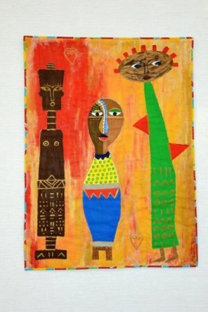 As I take regular walks through my Hyattsville, MD neighborhood and in South East, DC, where I work, I collect discarded beer and soda cans that have been flattened in traffic. I cleanse and transform unwelcome trash into painted masks mounted and framed or integrated into small quilts. The frames are recycled thrift shop finds that I paint to echo the themes of the masks and the quilts are made primarily from scraps salvaged from fashion production.